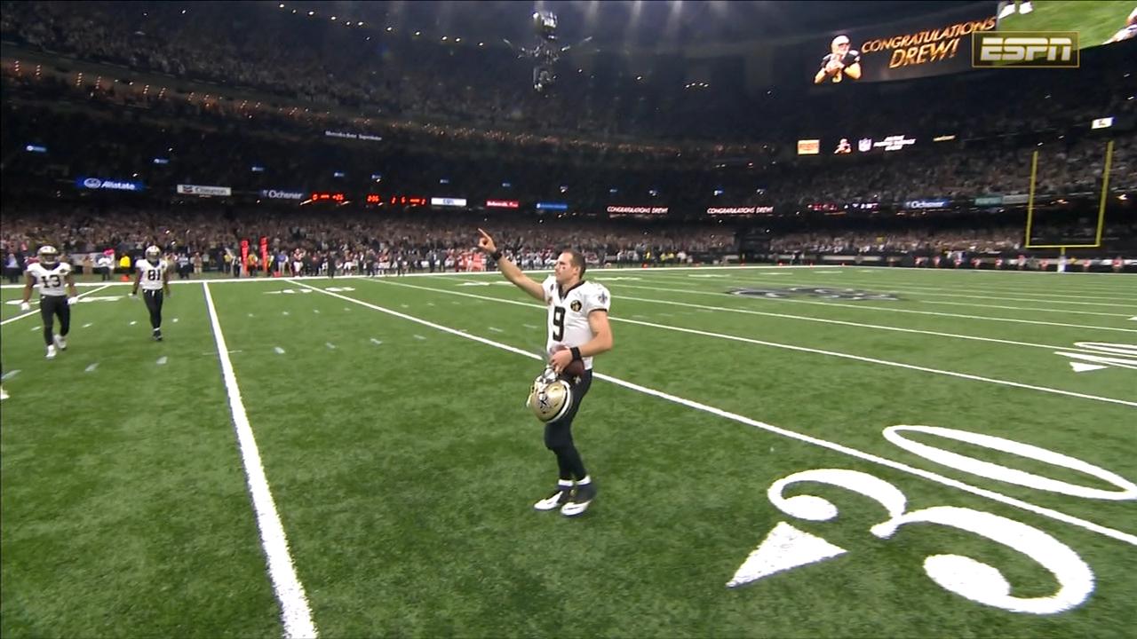 Do tej pory, kiedy Brees łamał rekordy, robił to za sprawą przyłożeń. W taki sposób złamał rekord Johnny’ego Unitasa oraz rekord Dana Marino, kiedy podając do Darrena Sprolesa został rekordzistą w ilości jardów w jednym sezonie. I historia raz jeszcze zatoczyła koło. Drew wykorzystał koszmarne krycie Redskins i rzucił piłkę do Tre’Quana Smitha. Ten nie miał problemów z pokonaniem jedynego pozostałego obrońcy gości i wbiegnięciem do endzone. 62 jardy, touchdown Saints. Rekord został pobity. A Tre’Quan zdobył swoje pierwsze przyłożenie w karierze. Superdome wybuchło. Sędziowie wręczyli papierek Breesowi, a cały mecz, zgodnie z zapowiedzią, został przerwany, by oddać się chwilowej celebracji. Drew, jak na niego przystało, celebrował z rodziną i większość chwały oddał swoim kolegom z zespołu. I tylko cieniem na tym pięknym momencie położyło się dziwne zachowanie komentatorów oraz sędziowie, którzy, pomimo ustaleń, nagrodzili Saints karą za celebrację. Ale to już nikogo nie interesowało, liczył się moment.